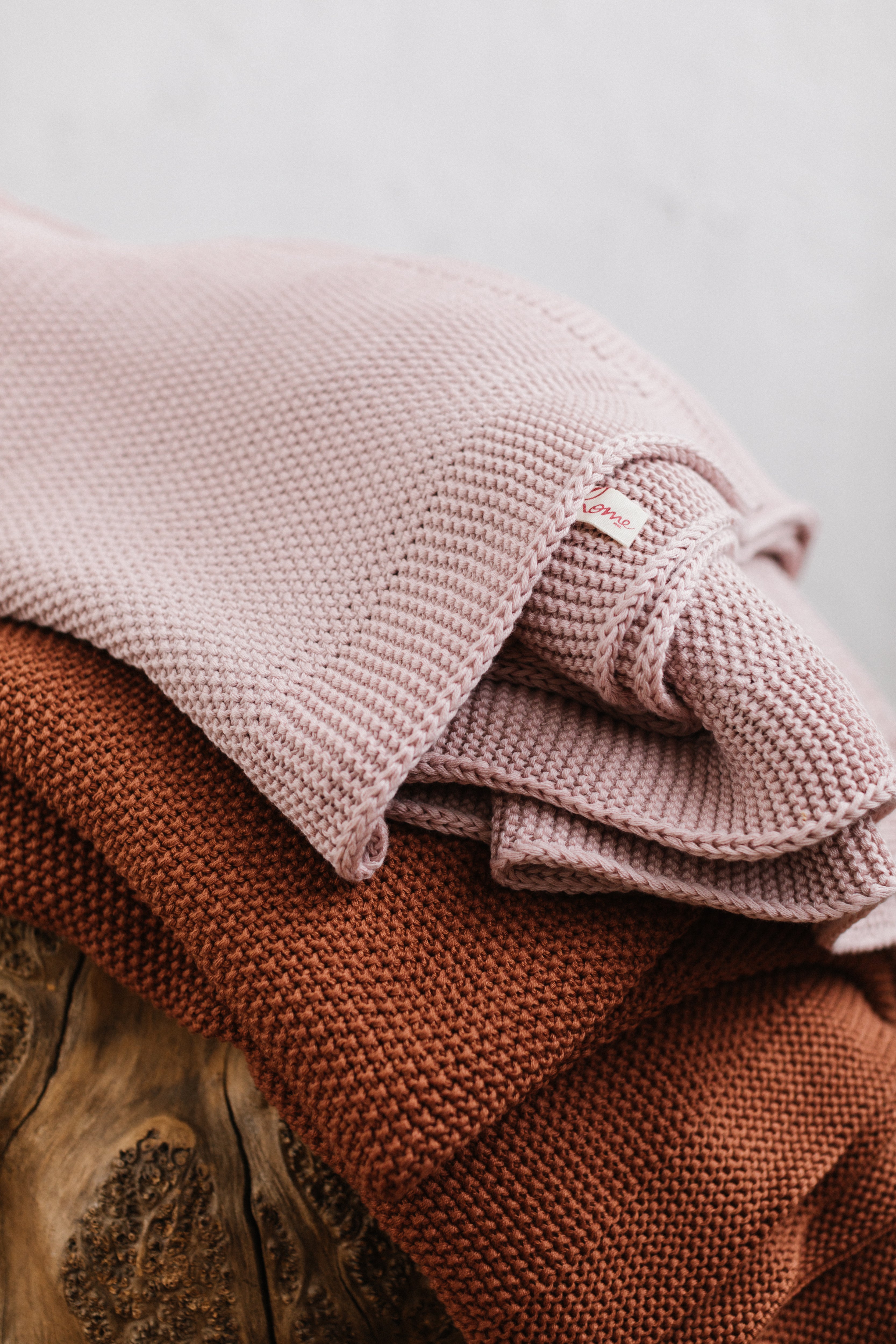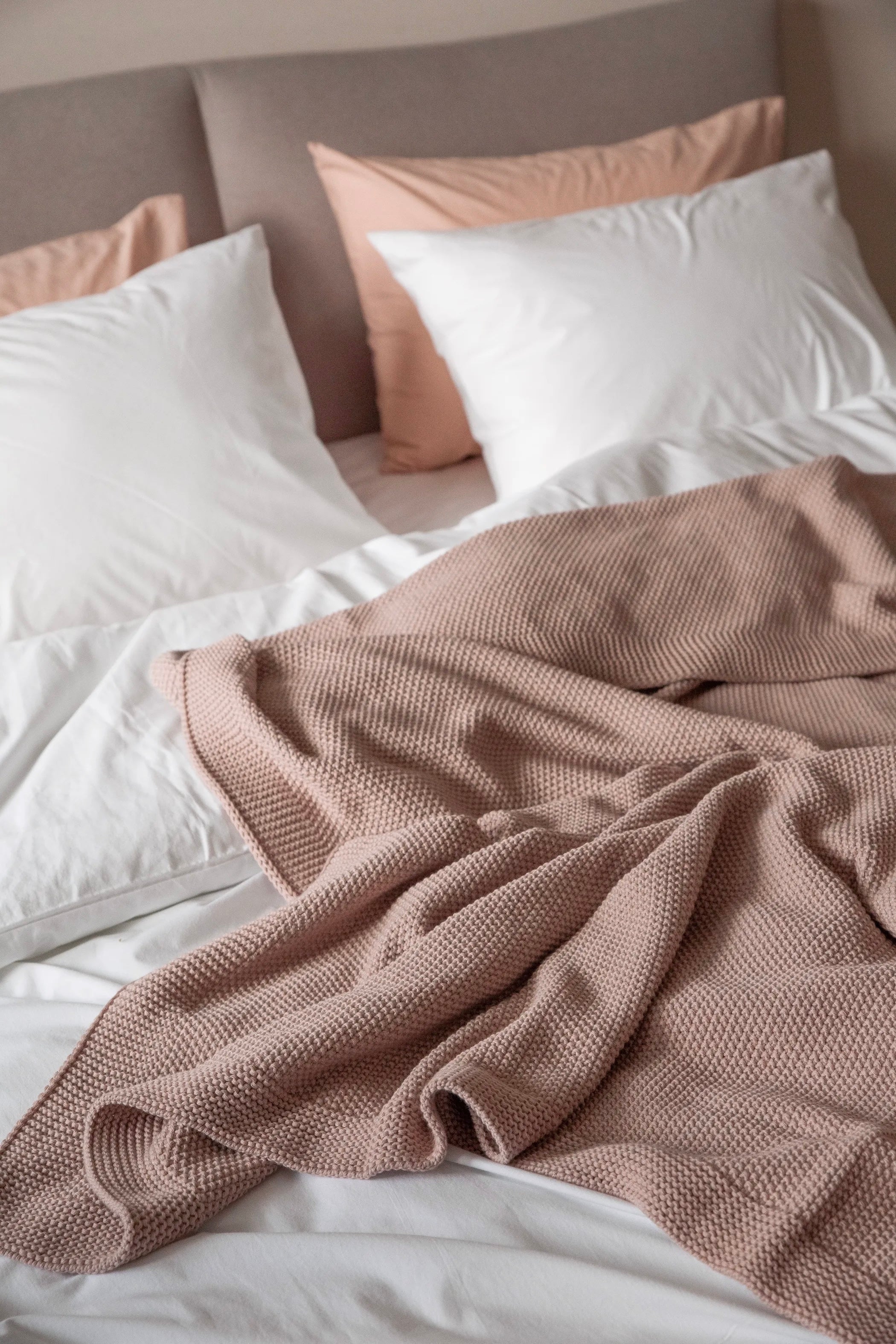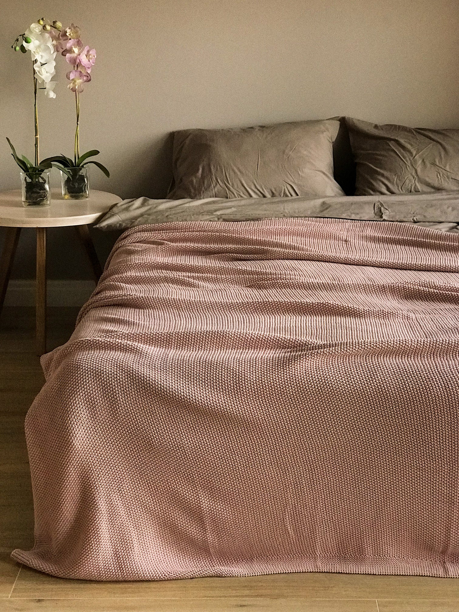 A soft and delicate plain-colored coarse-knit throw-blanket that will cover the entire surface of any bed or easily "embrace" your whole family at once.