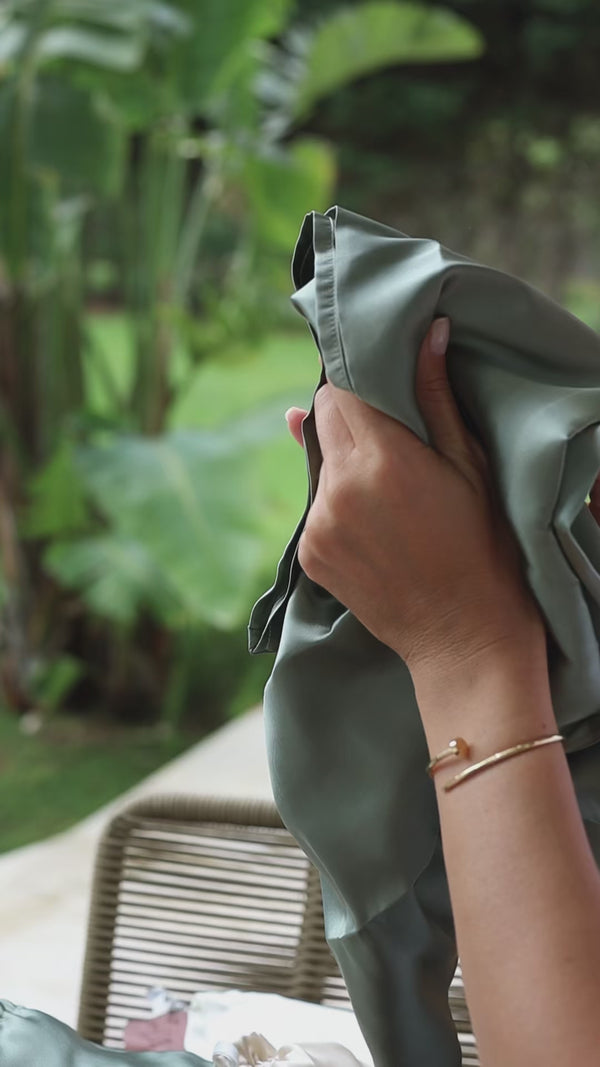 Створена з 100% натурального шовку преміальної якості — м’якого, ніжного й гіпоалергенного. Завдяки своїм природним властивостям даний матеріал практично не створює тертя зі шкірою при дотику. Тому рекомендується спати на наволочках із шовку для збереження прекрасного зовнішнього вигляду - він уповільнює процес появи зморшок, а також добре впливає на волосся. Шовк на 97% складається з органічних білків, тобто за своєю структурою та складом його волокно схоже зі шкірою людини. Він містить у собі амінокислоти, які беруть участь в омолоджуючих процесах організму. За рахунок своєї гігроскопічності шовк запобігає ламкості волосся і сприяють збереженню його блиску, що особливо актуально для хвилястого і кучерявого волосся, так як вони найшвидше втрачають вологу, плутаються і ламаються без правильного догляду.