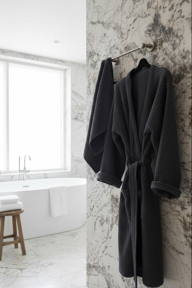 Мінімалістичні текстурні халати в одинадцяти кольорах максимально універсальні і практичні - вони підходять як для чоловіків, так і для жінок. Такий халат можна одягти після ванною або після душу і провести в ньому час перед сном в будинку. Він також забезпечить вам максимальний комфорт після плавання в басейні, після сауни або лазні.