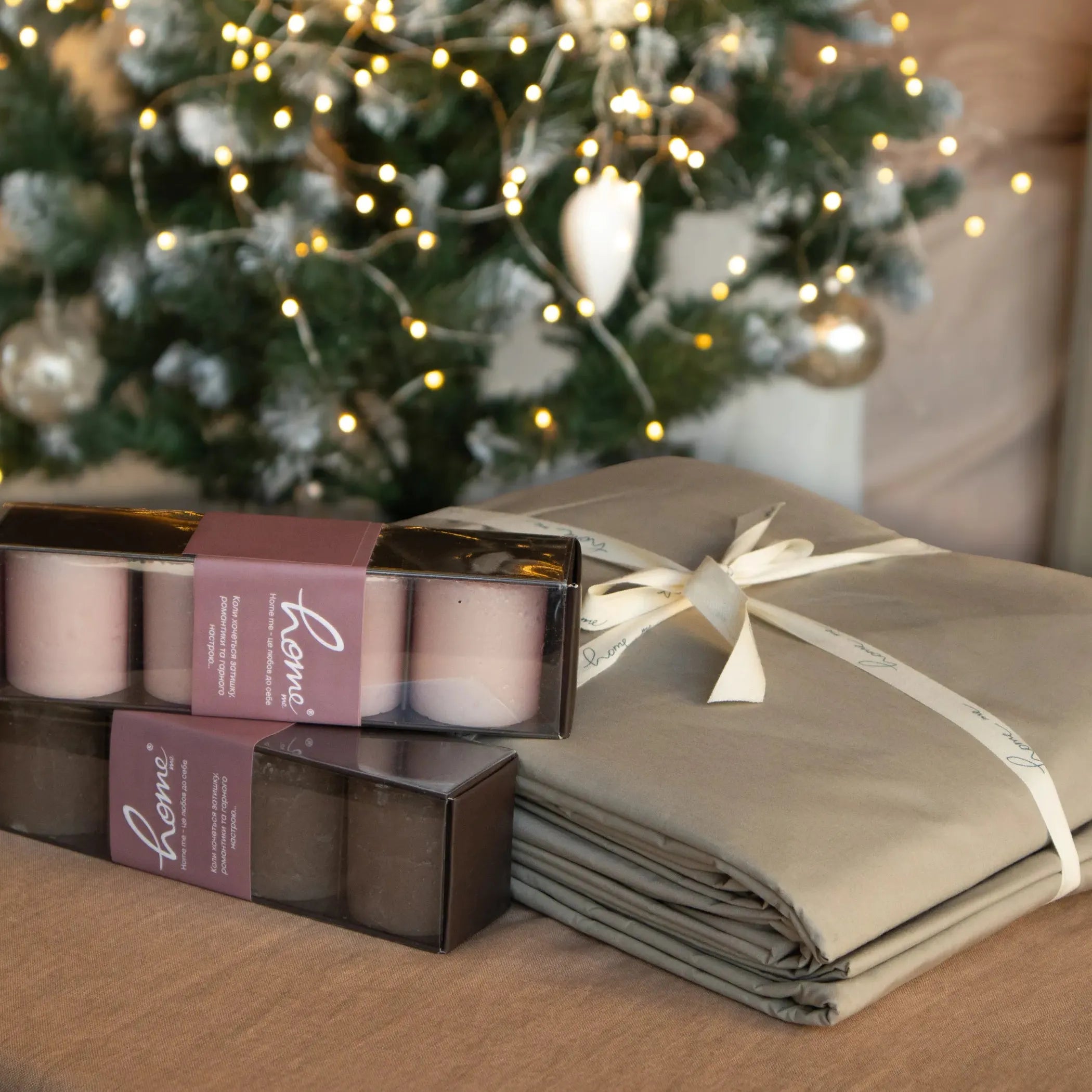 Набір приємної на дотик постільної білизни та свічки для романтичної атмосфери.