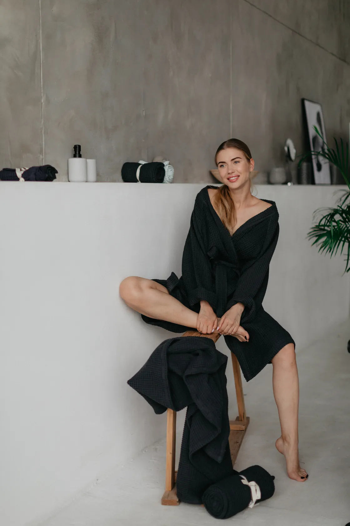 Минималистичные текстурные халаты в пяти цветах максимально универсальны и практичны – они подходят как для мужчин, так и для женщин. Такой халат можно надеть после ванной или после душа и провести в нем время перед сном в доме. Он также обеспечит вам максимальный комфорт после плавания в бассейне, сауны или бани.
