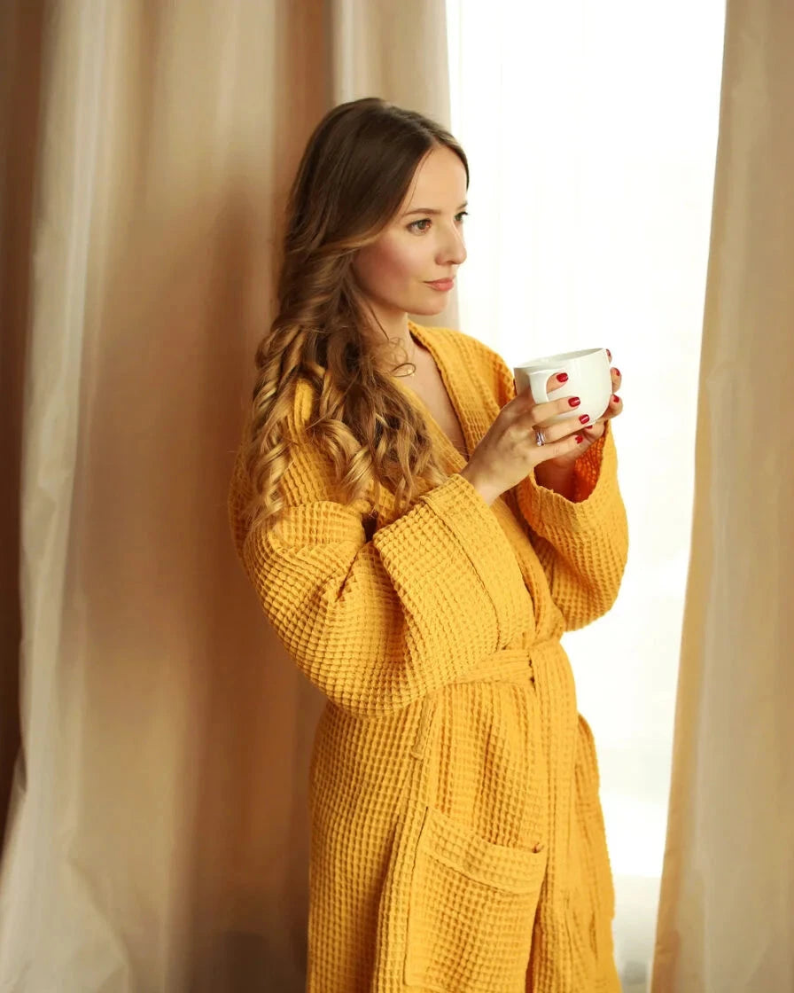 Минималистичные текстурные халаты в пяти цветах максимально универсальны и практичны – они подходят как для мужчин, так и для женщин. Такой халат можно надеть после ванной или после душа и провести в нем время перед сном в доме. Он также обеспечит вам максимальный комфорт после плавания в бассейне, сауны или бани.